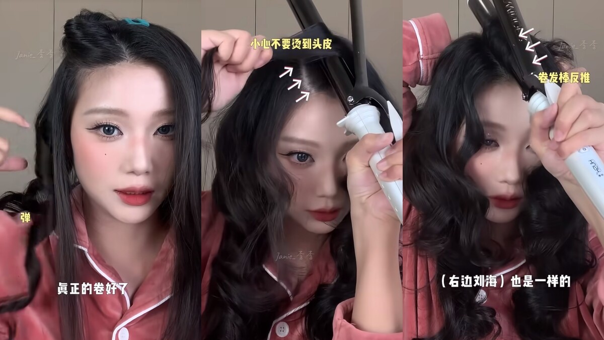 在捲好之後不要忘記瀏海的弧度,可以用電棒的捲度稍微停留一下,要注意不要靠太近會燙到頭皮,兩邊都是一樣的動作。