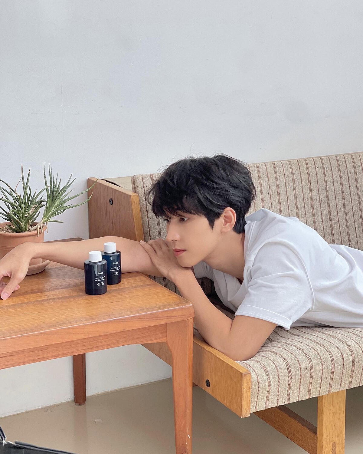 微長的髮絲加上學生感的帽T,任誰看了都想要有一個這樣的學長,雖然看起來有股文青、藝術的氛圍,不過圓佑絕對是宅在家打電動的理工男(畢竟自行設計的周邊,還推出了機械鍵盤呢!)