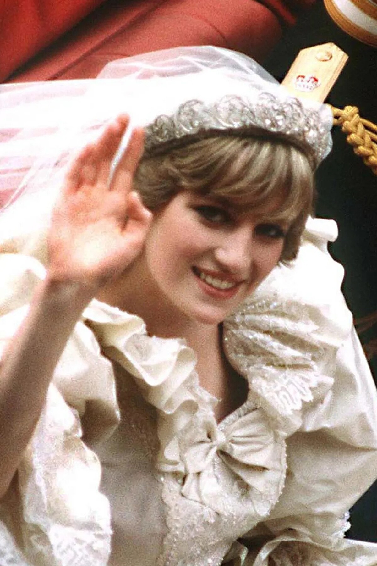 不得不說珍珠的皇冠和耳飾實在讓人很難將焦點放在其他部分,不過黛安娜王妃的以輕盈華麗的捲髮做為搭配,雖然是捲髮卻完全不顯毛躁。