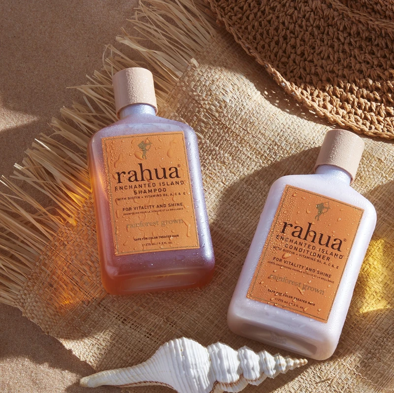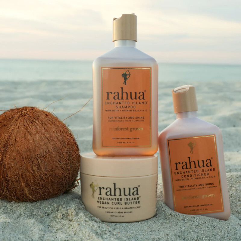 rahua島嶼花園煥活系列,包含洗髮精、潤髮乳,以及捲髮保濕霜,全系列都添加由橙皮、紫花苜蓿、木瓜、鳳梨和大麥草等有機蔬果,結合植物益生菌製成的「植物性生物素B7」,強韌頭髮結構與彈性,並防止乾燥,達到強健髮質、穩固毛囊的效果,成分中蘊含多種適合不同類型髮肌的維他命,就像是大秀髮的「綜合維他命」一樣,也特別推薦給經過染燙、長時間曝曬太陽的受損髮質。