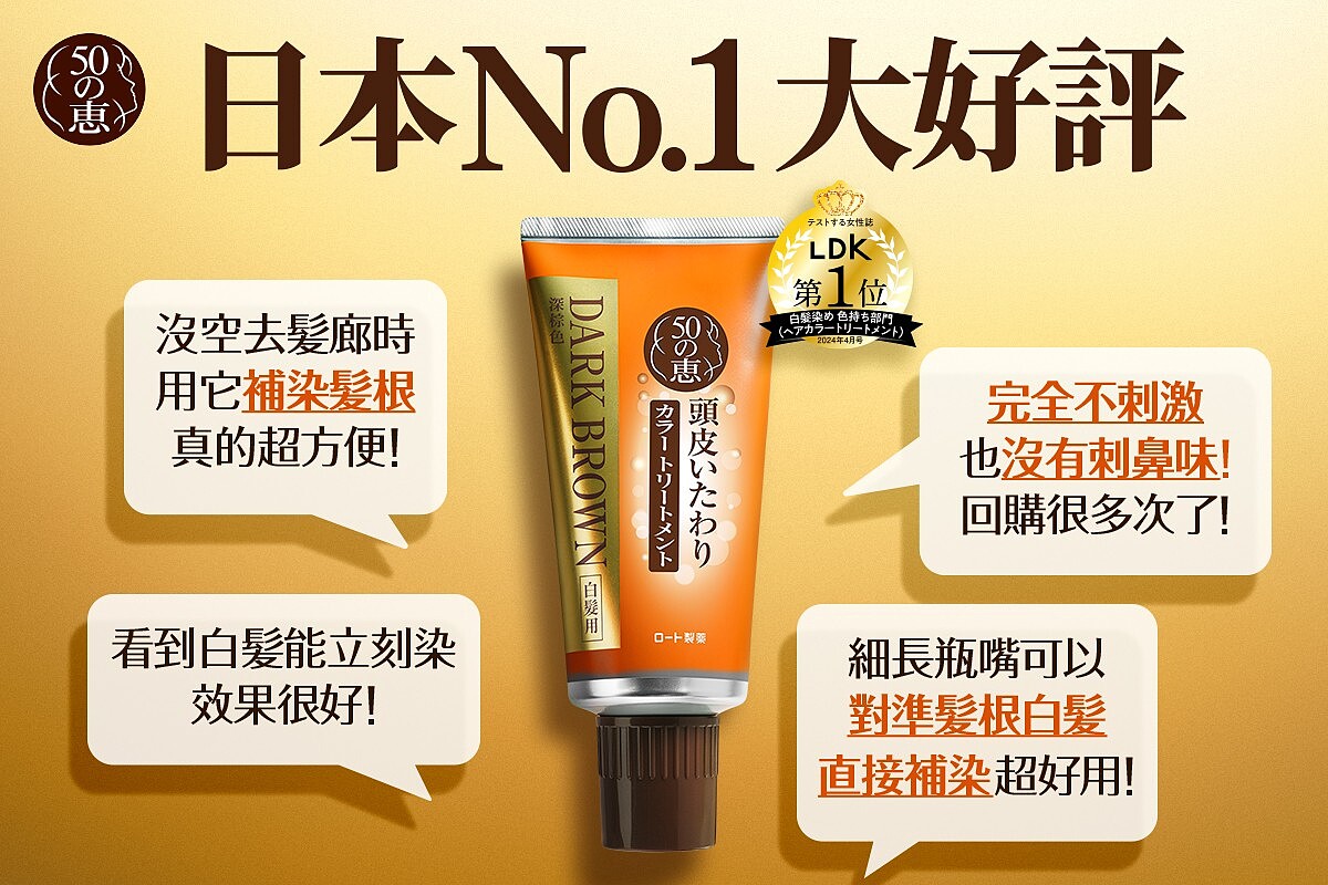 這就是為什麼「50惠海藻染髮護髮霜」在日本一上市,就迅速帶動熟齡女性的溫和漸進式染髮熱潮,同時做到染髮與護髮並兼顧頭皮健康的產品,可說是最令人滿意的安心美髮新選擇!『50惠海藻染髮護髮霜』,染髮時不傷頭皮頭髮,也沒有刺鼻氣味,染完髮質還能像上髮廊護髮完一樣烏亮,絕對是能夠獲得日本NO.1大好評的原因!