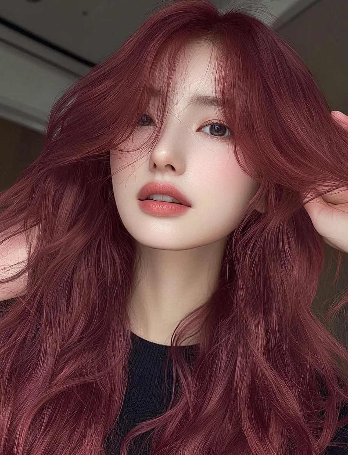 櫻桃紅聽起來會很紅,但其實這是一種偏深的暖紅色!深紅棕中帶點櫻桃水果的甜感,非常適合喜歡走溫柔甜美路線的女生,既不挑膚色,又能讓人看起來更有活力,非常適合過年的喜慶氛圍,加上一頭微捲的浪漫長髮,顯白甜美到讓人忍不住多看兩眼。
