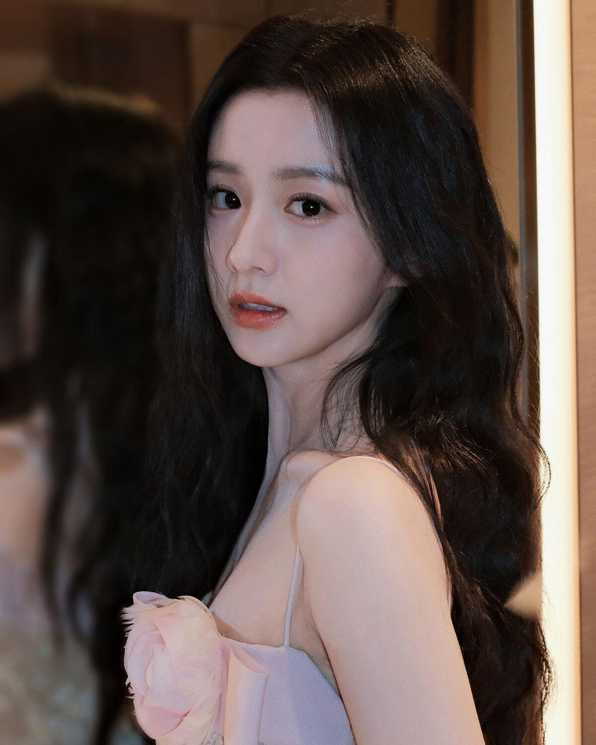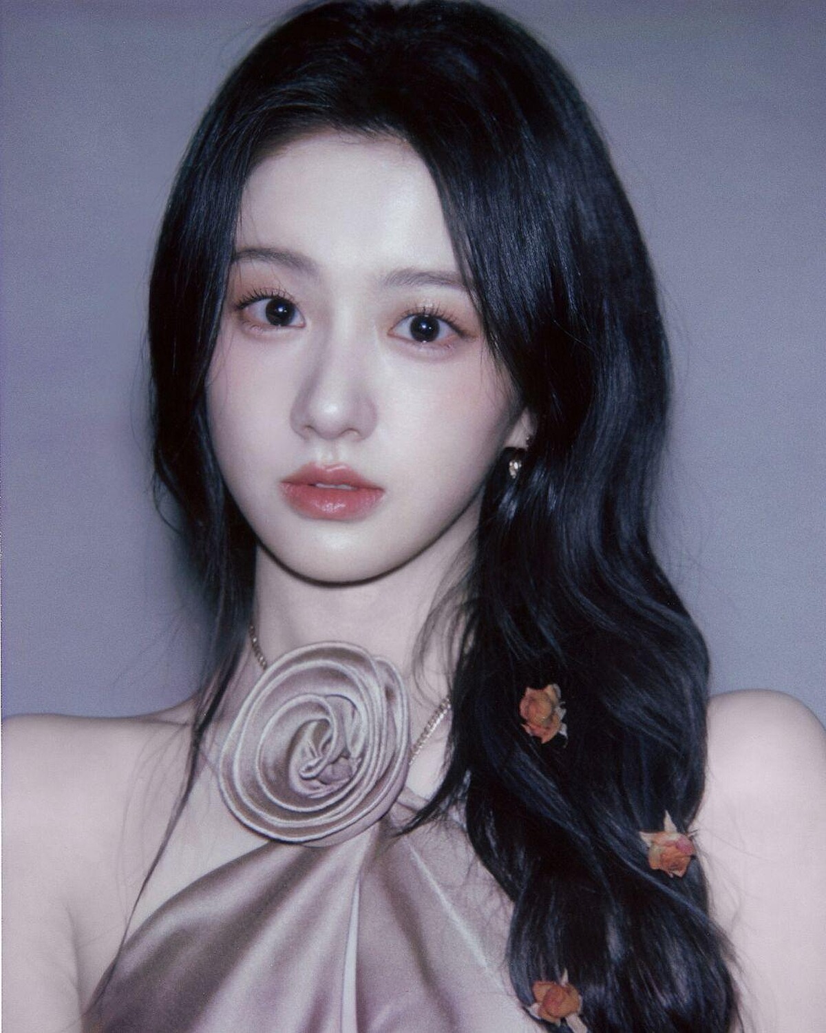 霧黑髮色中藏著微微的冷灰調,大波浪從下巴開始延伸至髮尾、配上玫瑰點綴,整體光澤感柔化,這款髮型刻意把捲度拉鬆,呈現出一種內斂的美!