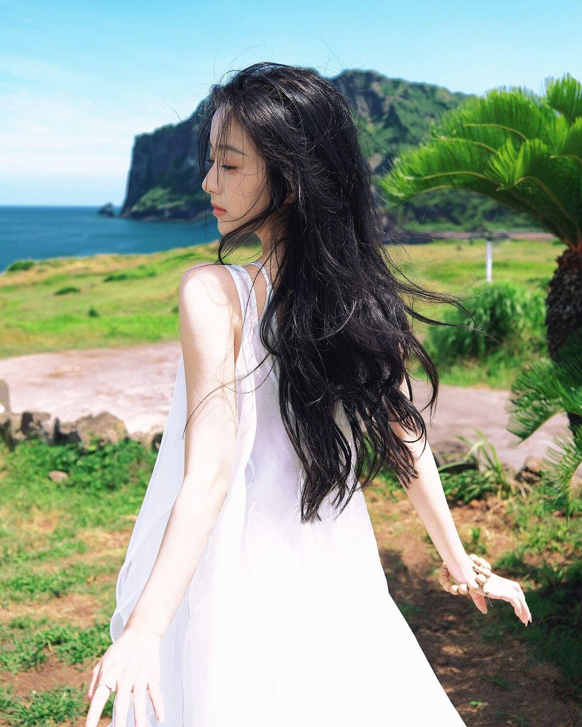 髮尾自然落在胸口下方,略帶彎度的中波浪線條,從髮根開始的微鬆蓬度讓整體不顯厚重,髮絲微微分層,營造出輕透的「空氣層次」這款髮型最迷人的地方是那種自然的柔軟感,搭配米白或裸色系服裝,能散發出一種乾淨而純粹的夏日氣息。