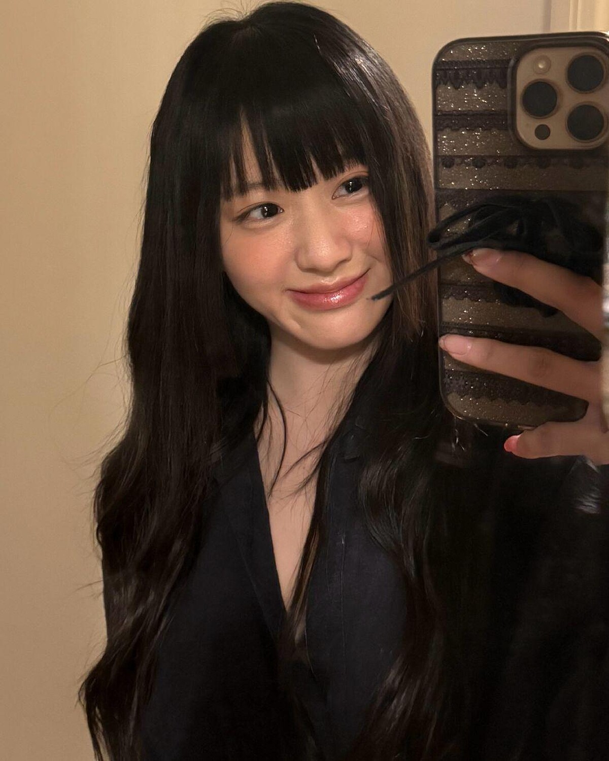 細直髮整齊垂落,髮尾微微內收,營造出乾淨的立體輪廓,再搭配平瀏海落在眉毛上方,可以讓五官更集中,呈現出韓系少女特有的復古氛圍。