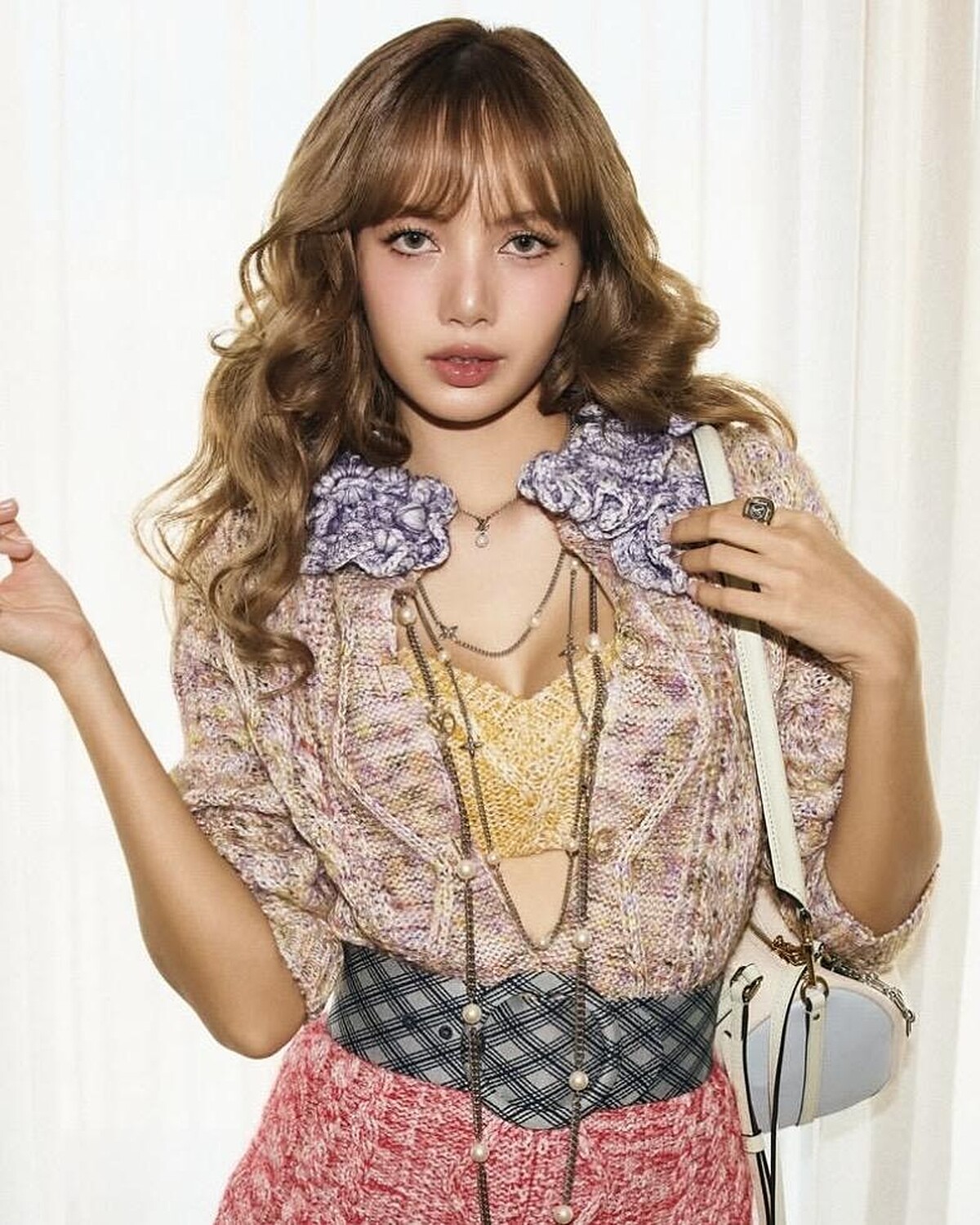 Lisa 最新的捲髮造型就是這款復古羊毛捲,細小均勻的捲度讓整頭像雲朵一樣蓬鬆,髮根特別加強澎鬆度,所以臉部線條會被自然包覆,看起來更柔、更甜。瀏海保留鬆散的碎感,有種的慵懶魅力。