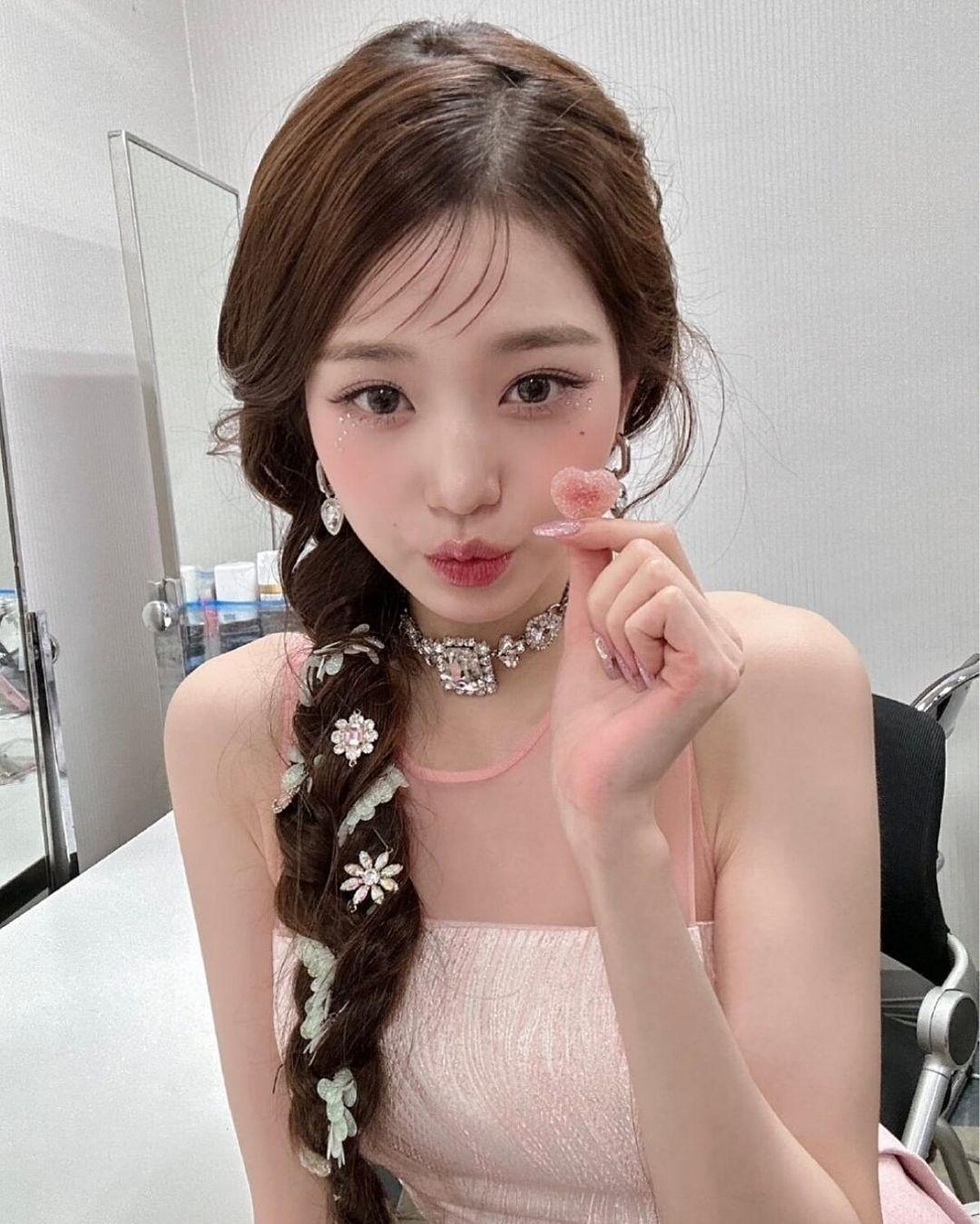 這款屬於完成度最高的辮子造型,頭髮集中在單側編成較長的辮子,透過花朵、珍珠或水晶配件點綴,讓整體看起來更華麗。臉側與瀏海處理得非常乾淨,重點全部放在辮子本身,是很適合舞台、活動或拍攝使用的款式,搭配粉嫩或裸色系妝容,整體會呈現柔焦、仙氣滿滿的效果。