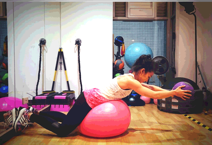 ○ 軀幹俯臥於抗力球上,雙腳靠牆頂住。