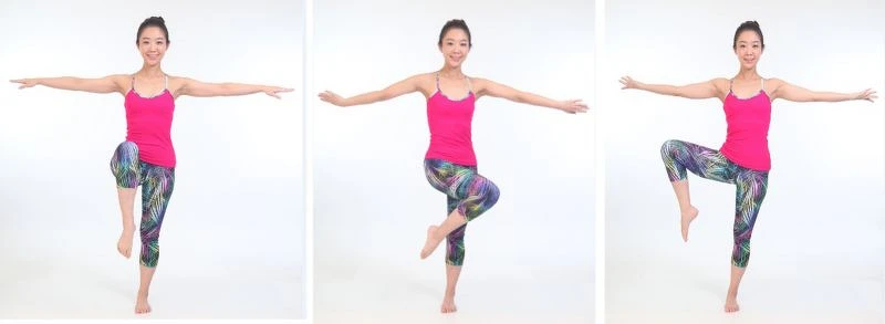 ①站在瑜伽墊上,右腳曲膝抬高,挺直身體,雙手往左右打開伸直與肩膀同高、掌心朝下預備。