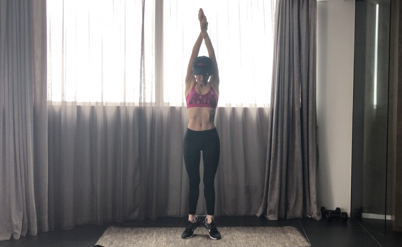 步驟1:雙腳分開,約同肩膀寬度,舉高並伸直雙手。