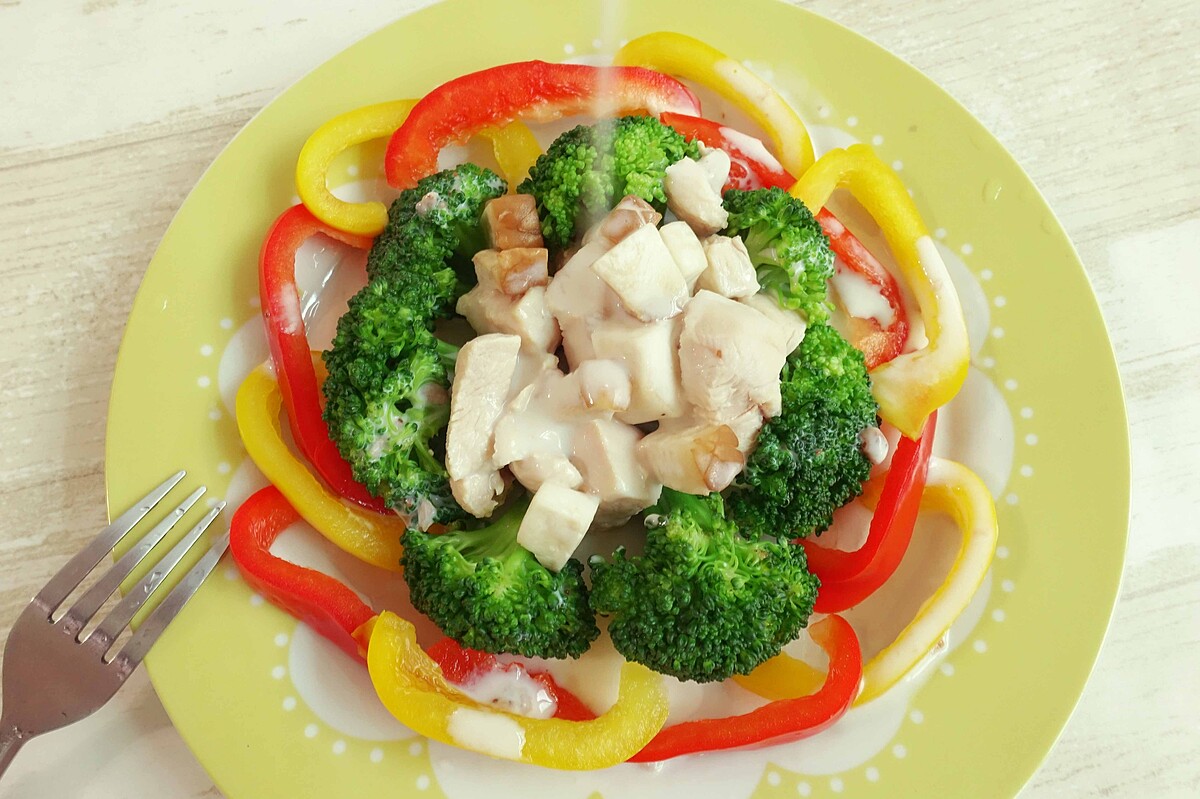 可以加入幾樣喜愛的蔬果,營養更多元。搭配低熱量的雞肉,雞肉富含蛋白質,對於健身也是非常重要的營養,接著再跟著M編用優酪乳取代調味醬,才是健身女孩的減法飲食最高指標!