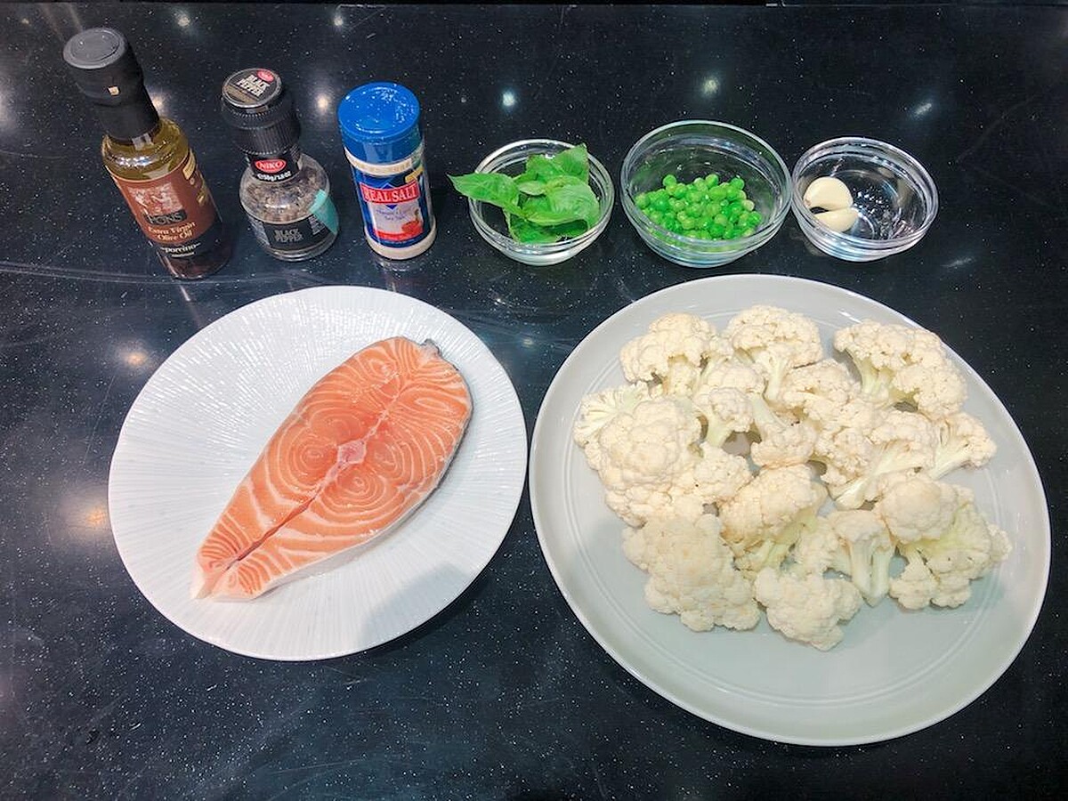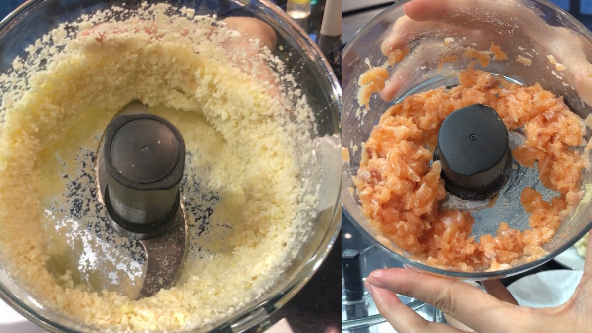 1.將鮭魚肉切碎、白花椰菜切碎至米粒大小