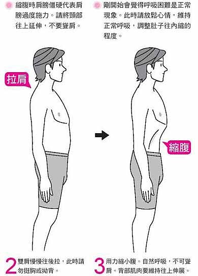 「植森式縮肚法」只有3個步驟,分別是:「背部挺直」、「肩膀向後拉」、及「用力縮肚」。特別體醒的是,要姿勢正確才可以達到瘦肚子的效果喔!