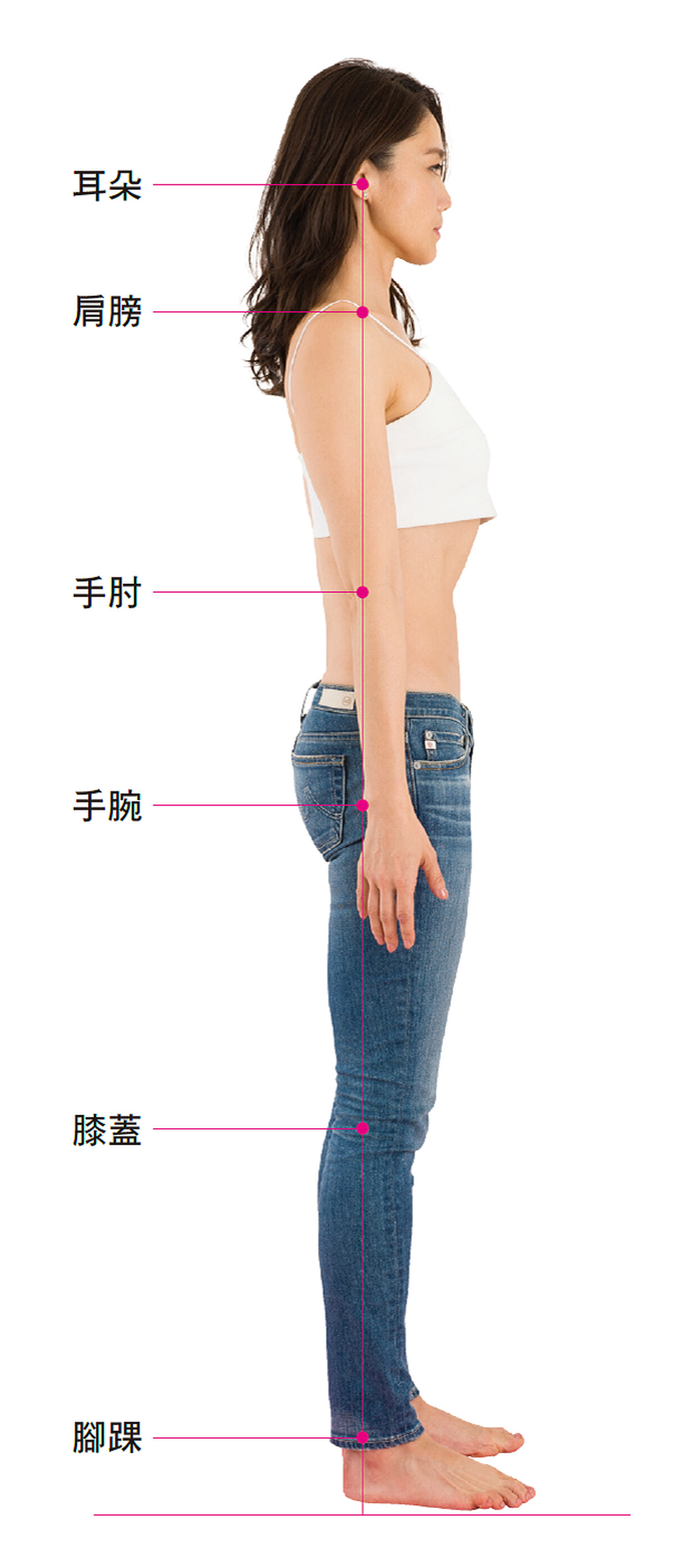 1. 頸部:從後腦勺至肩膀,呈現筆直的垂直狀態。肩膀位在耳朵正下方。