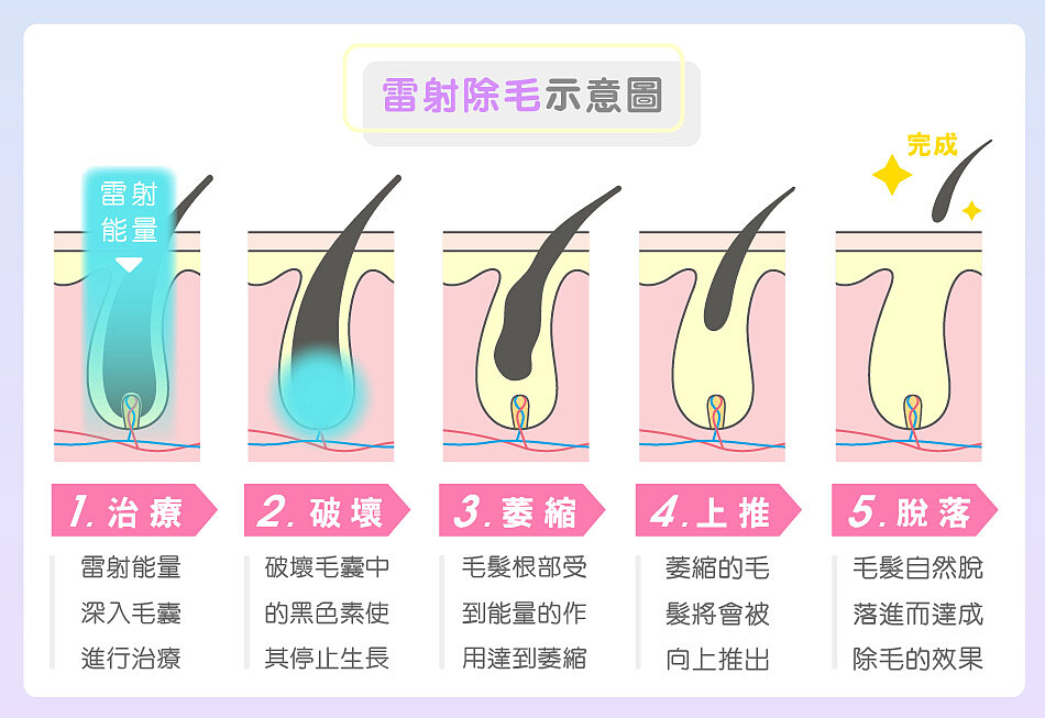 A:雷射除毛的差別只是在於波長,但不管選擇哪一種,原理都是利用「具有黑色素的毛囊,吸收雷射光能量後轉化成熱能,連帶破壞掉附近的毛囊幹細胞,使毛髮無法生長」。