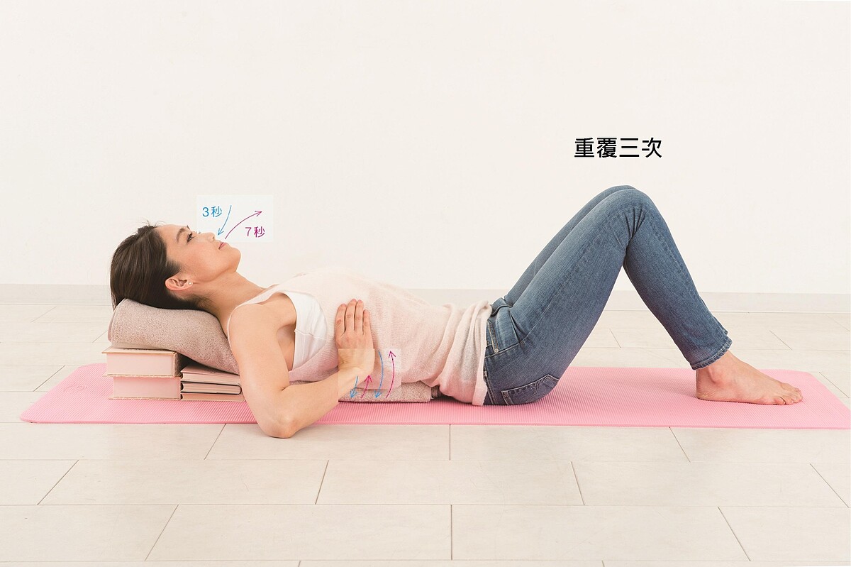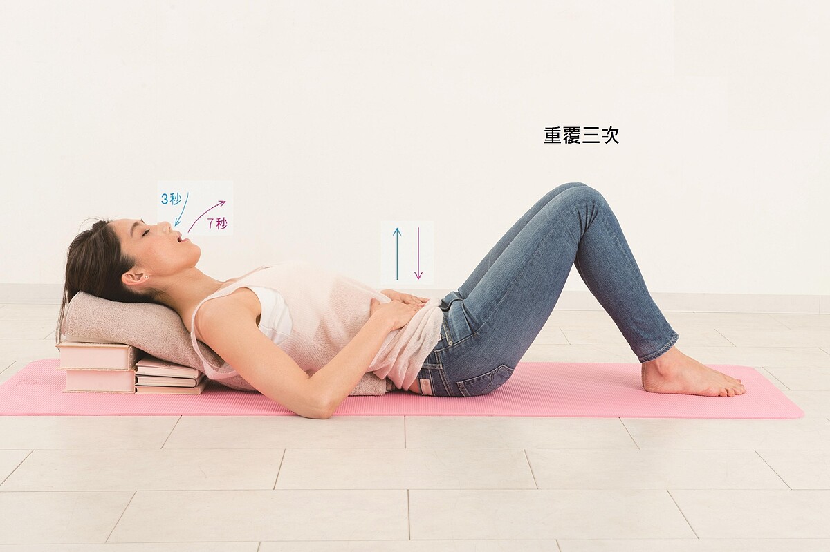 基本上須花3秒時間從鼻子吸氣,再花7秒鐘由嘴巴吐氣。藉由這個呼吸法,讓腹部、背部及肋骨周圍像氣球一樣鼓起來,然後再縮進去,使僵硬不堪的身體獲得放鬆,邊呼吸還能邊運動。