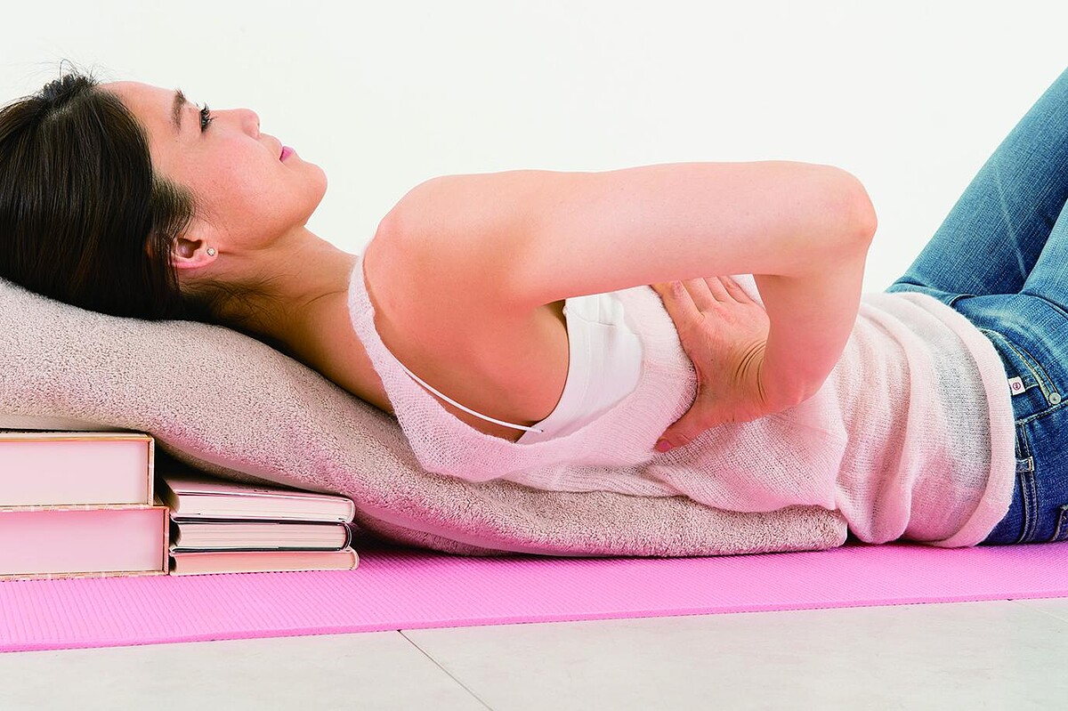 零位訓練會將浴巾捲起來放在背部下方,仰躺下來進行。只須採取這個躺姿,就能使萎縮的頸部及肩膀逐漸回歸零位。不需要使用任何器材或工具,單靠自己的體重(自體重量),就能輕鬆矯正萎縮現象。