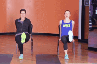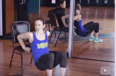 1.先來一套椅子操,手心向後支撐在椅子上,上半身盡量保持垂直上下移動,一組做30個。這個動作可以鍛鍊手臂後側的肌肉群。