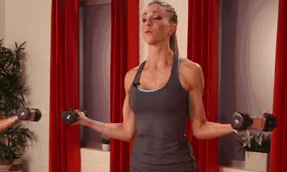 3.接下來啞鈴就要上場了!家裡沒有啞鈴的話,也可以將用完的礦泉水瓶裝滿水代替。從最基礎的手持啞鈴向上抬動作做起,一組30個,這個動作可以鍛鍊大臂內側肌肉。