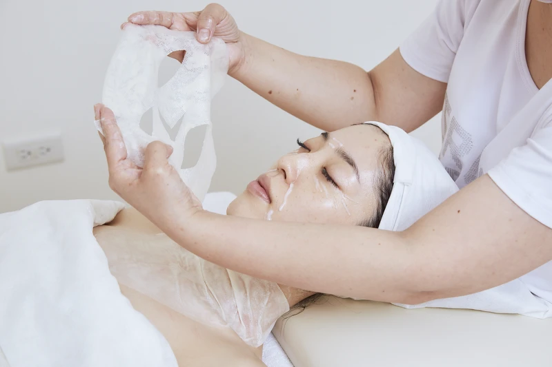 Step3撫紋微導珍珠面膜,共有三大片,臉部、頸部,胸前,敷上後面膜溫度會隨著人體溫度調整,讓厚敷的密集撫紋乳精華霜充份吸收,確實達到撫紋效果。