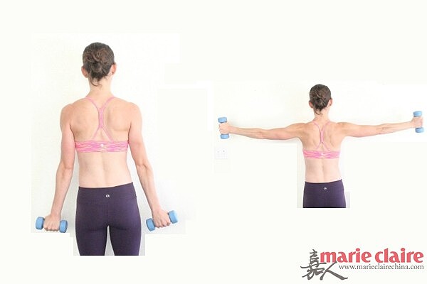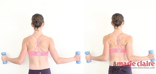 Step2:掌心向前,手臂直直舉起啞鈴,再從身體兩側彎曲向下。重量降低到腰的高度,擠壓你的肩胛骨,重覆做12次。