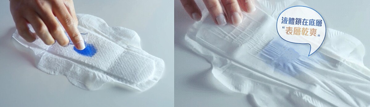 液體衛生棉有高達96%的空間都能主動吸收經血,特有的「黑洞吸收孔」就像黑洞一樣,可以把經血拉到底部擴散。M編一開始還以為經血量變少(殊不知是自己嚇自己),其實衛生棉翻過來看,發現原來是經血都被吸到底部,難怪表層那麼乾爽~