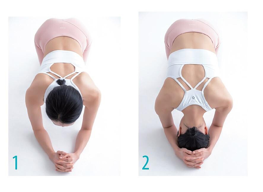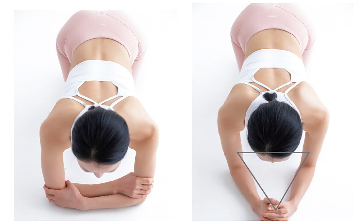 第二個重點是十指緊扣的手的位置和手勢。先維持好打開與肩同寬的兩側手肘位置,雙手十指緊扣後往前推出,會形成三角形。此時,十指緊扣的手在雙手中間做出球形,像是握住杯子一樣, 讓掌根(接近手腕的部位)碰到後腦杓,而非整個手掌包覆住後腦杓。這樣做十指才能緊緊扣住,並支撐住後腦杓,對於抓住重心也會更有助益。