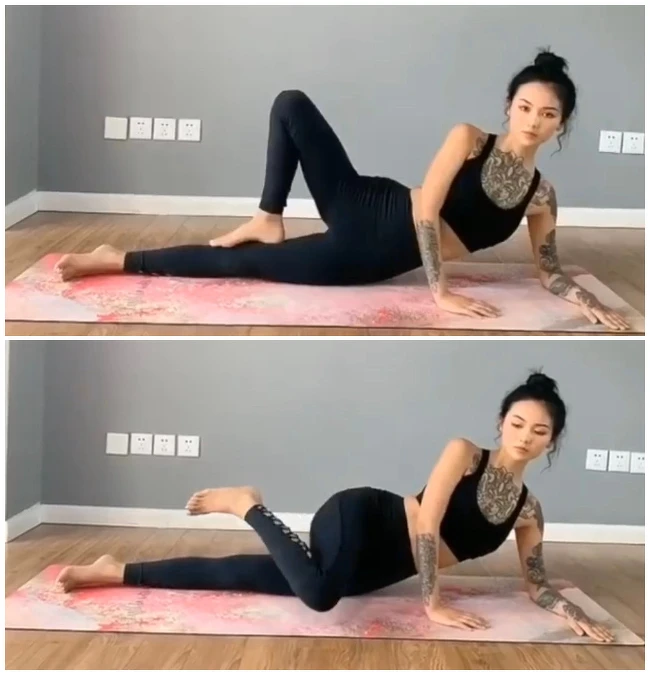 側躺,左邊彎曲,右手放在胸前,腹部收緊核心,右腿彎曲、膝蓋輕點地面然後抬起,請注意保持平衡,做兩組,每組15次。