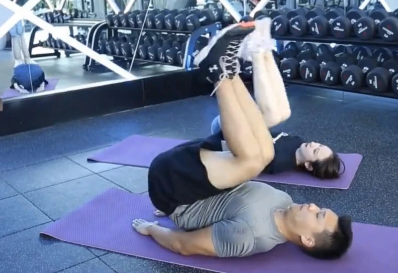 仰躺於瑜珈墊上,雙腿併攏並抬起,然後彎曲,膝蓋往身體方向動作,共20次。