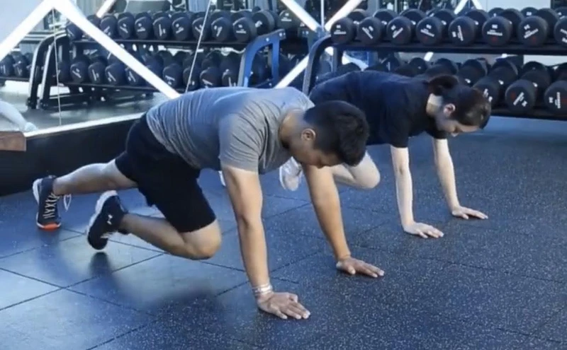 面朝地,雙手撐起,雙腿伸直腳尖踮地,左右腿輪流往前跨,像是跑步時的起始動作,共20次。