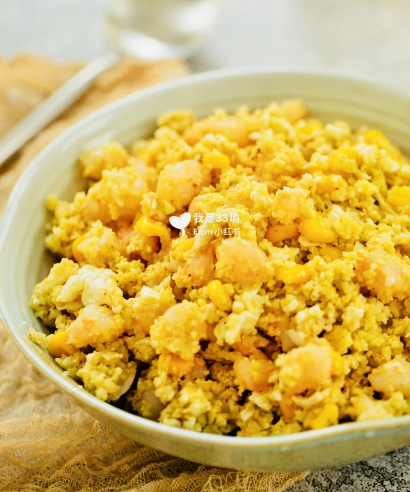 花椰菜,蝦仁,玉米,雞蛋,橄欖油