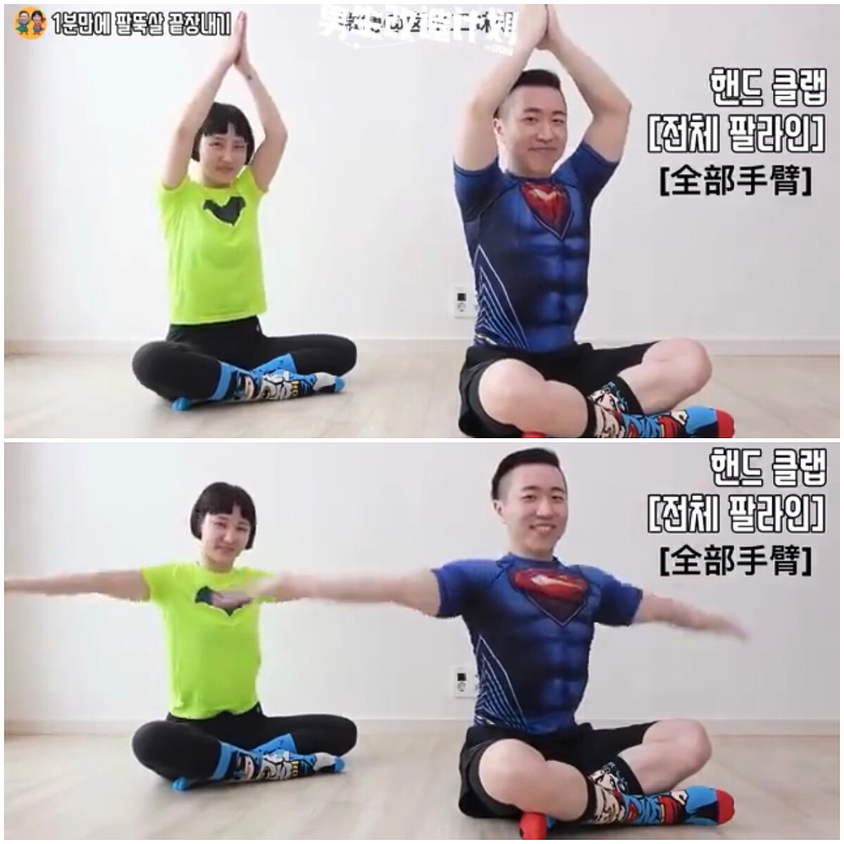 將手臂往上、雙手合掌併攏,然後跟著節拍雙手往兩側伸直,不要下垂,重複動作。