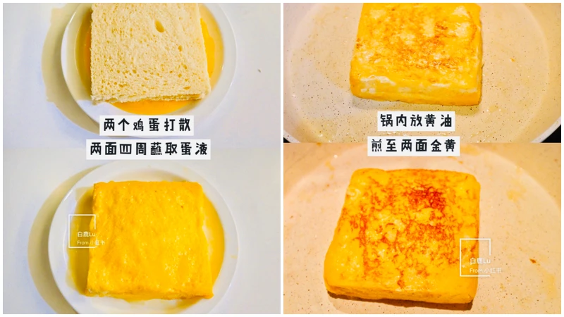 3.將吐司放到蛋液中充分浸潤,兩面和四周都要沾上蛋液。
