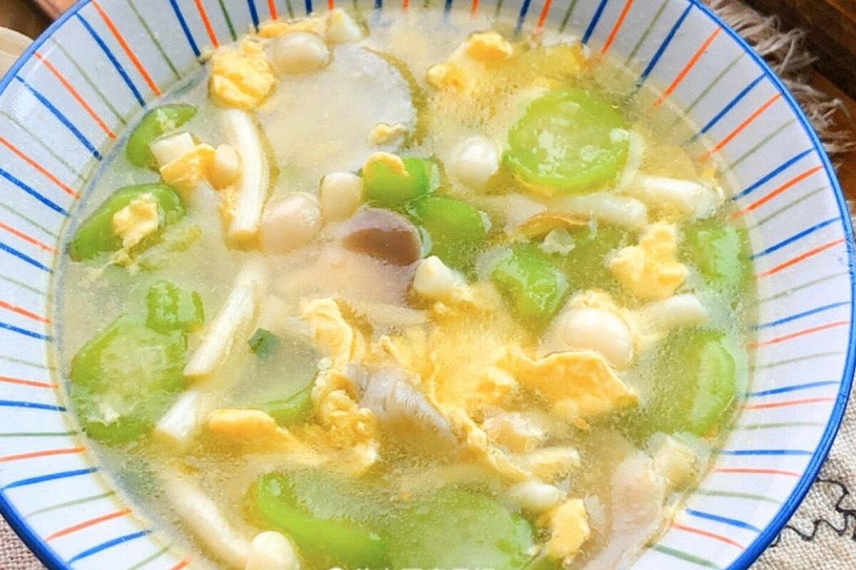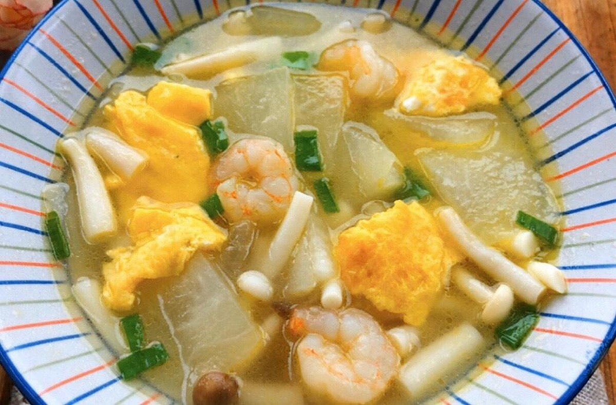 食材:冬瓜,蝦仁,鴻喜菇、雞蛋,蔥花