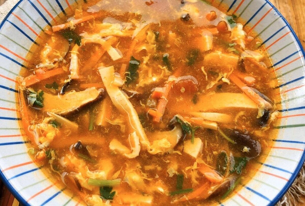 2.熱油後放蕃茄丁翻炒出汁,加兩碗清水煮開,放入切好的蔬菜絲,加一匙醬油、兩匙白醋、一點陳年醬油、一小匙鹽、一小匙黑胡椒,放入水後淋上蛋汁~出鍋前放香菜蔥花即可。