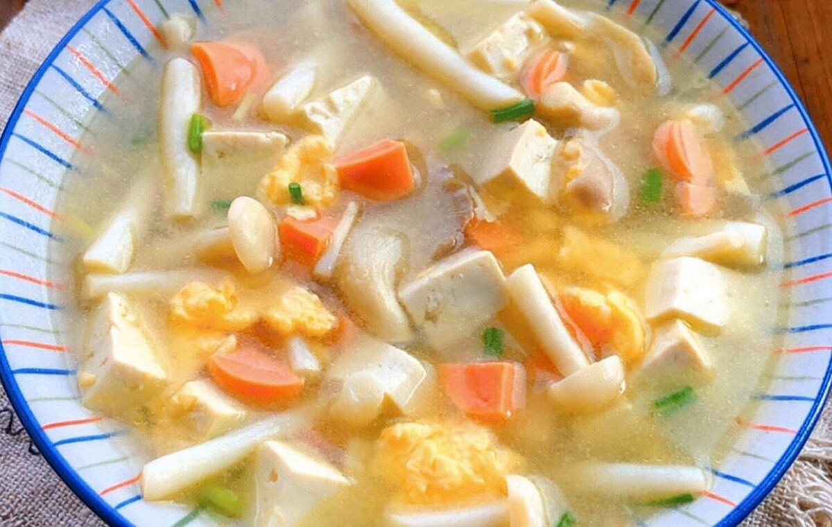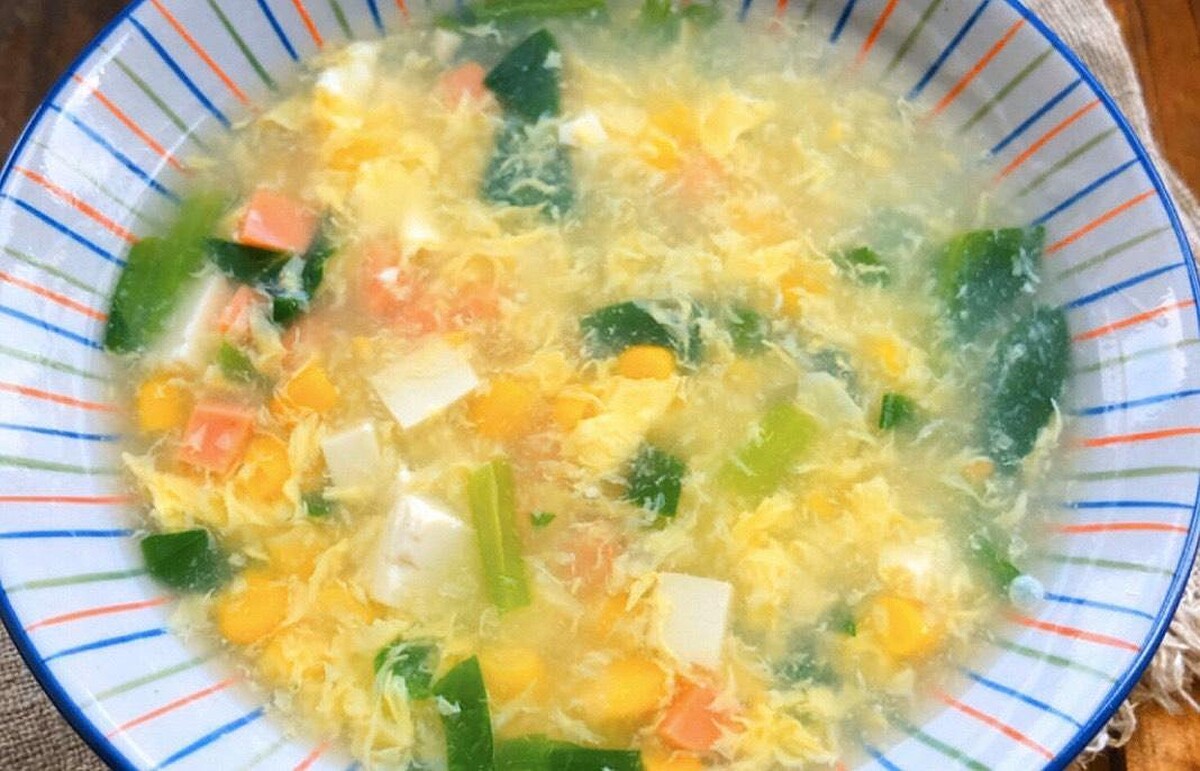 玉米粒、豆腐、青菜、火腿、雞蛋、蔥薑