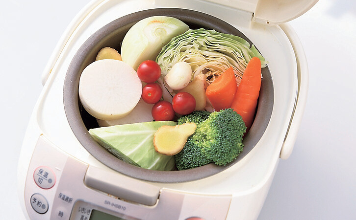 將除了鹽以外的材料全部倒入電子鍋中,再撒入鹽,接著以「白米」模式煮。昆布須放在底層。電子鍋容納不下時,可分二次煮,或是將青花菜、高麗菜及小番茄另外用微波爐等器具加熱至軟為止。從電子鍋取出,放涼後再切成適中大小。