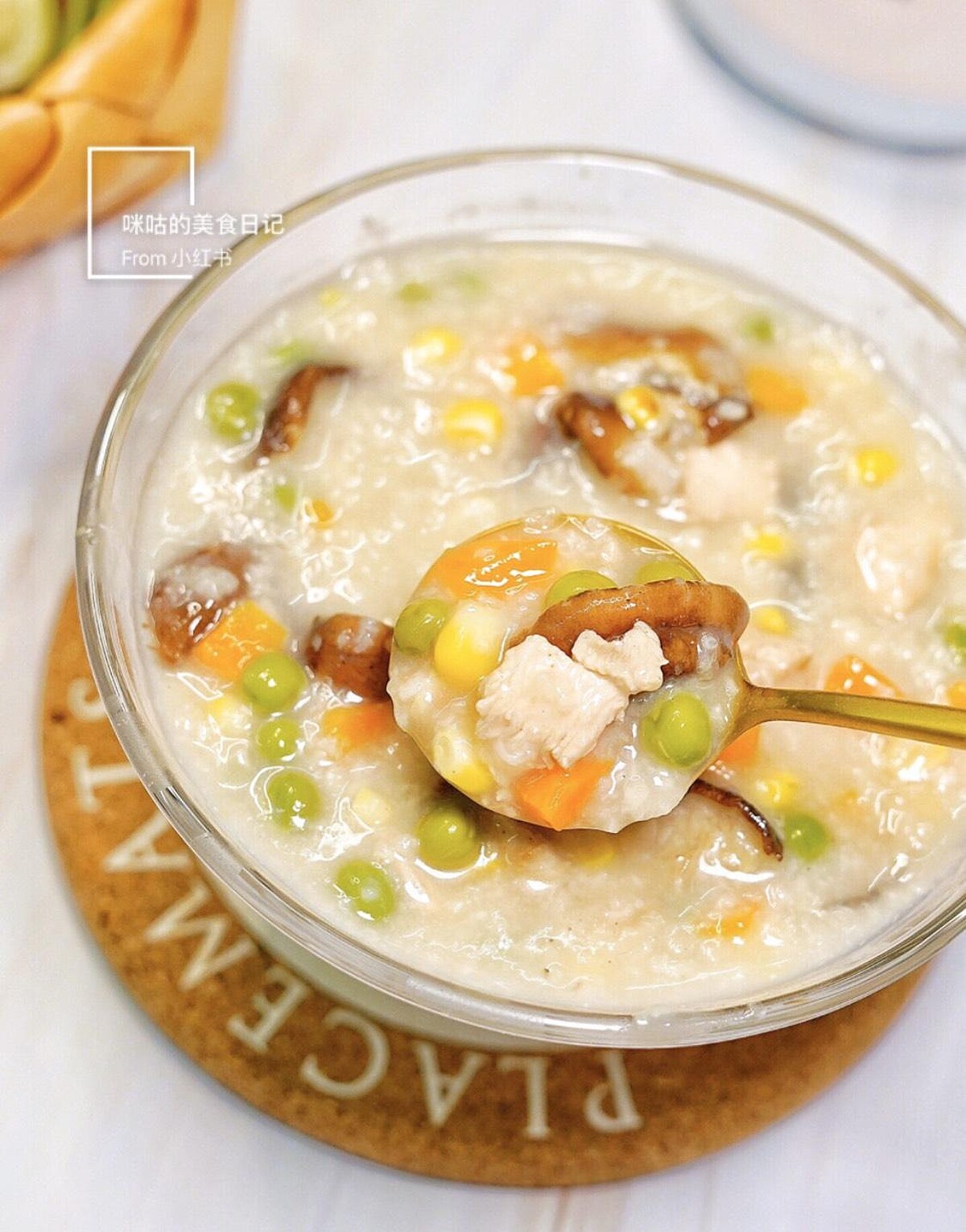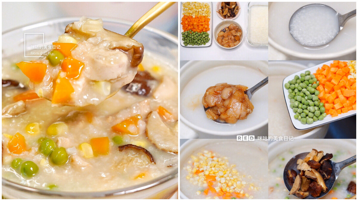 白米30克、雞胸肉200克、香菇2-3顆、胡蘿蔔半根、玉米半根、青豆50克
