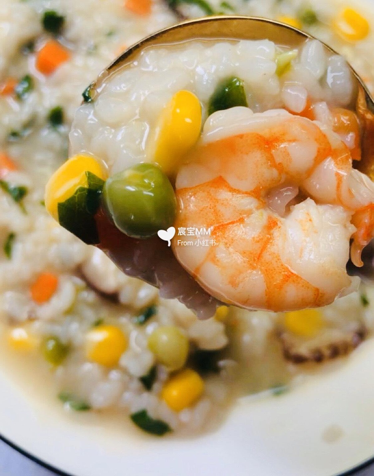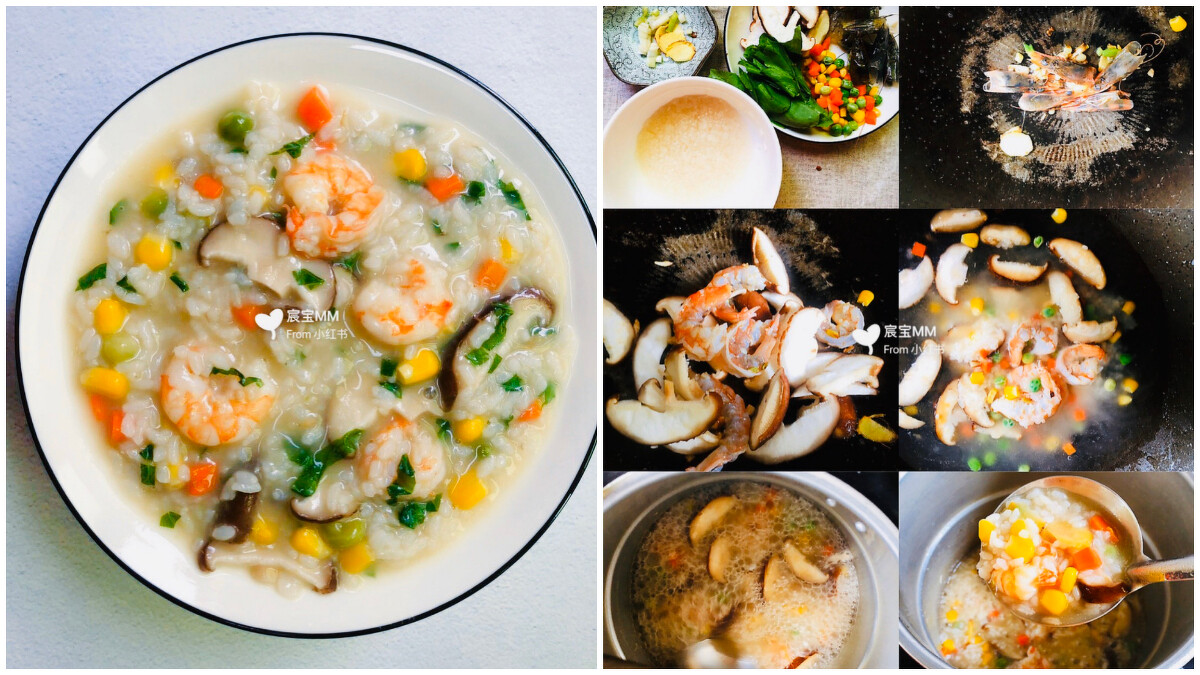 鮮蝦8隻、白米一把、雜蔬菜丁一小碗、青菜兩棵、香菇4朵、胡椒粉鹽少許、蒜末蔥末薑片適量