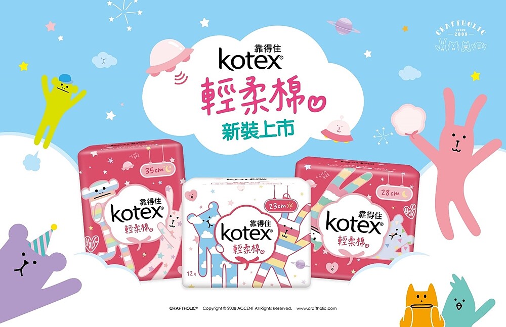 Kotex輕柔棉系列主打柔軟親膚表層,給肌膚零摩擦的頂級呵護,擁有許多死忠鐵粉。這次首度攜手CRAFTHOLIC宇宙人的聯名款,已於2019年12月中上市。為慶祝聯名款上市,即日起至2020/1/30期間,凡購買Kotex指定組包商品,隨袋即附贈只送不賣的宇宙人小提袋(數量有限,送完為止)。