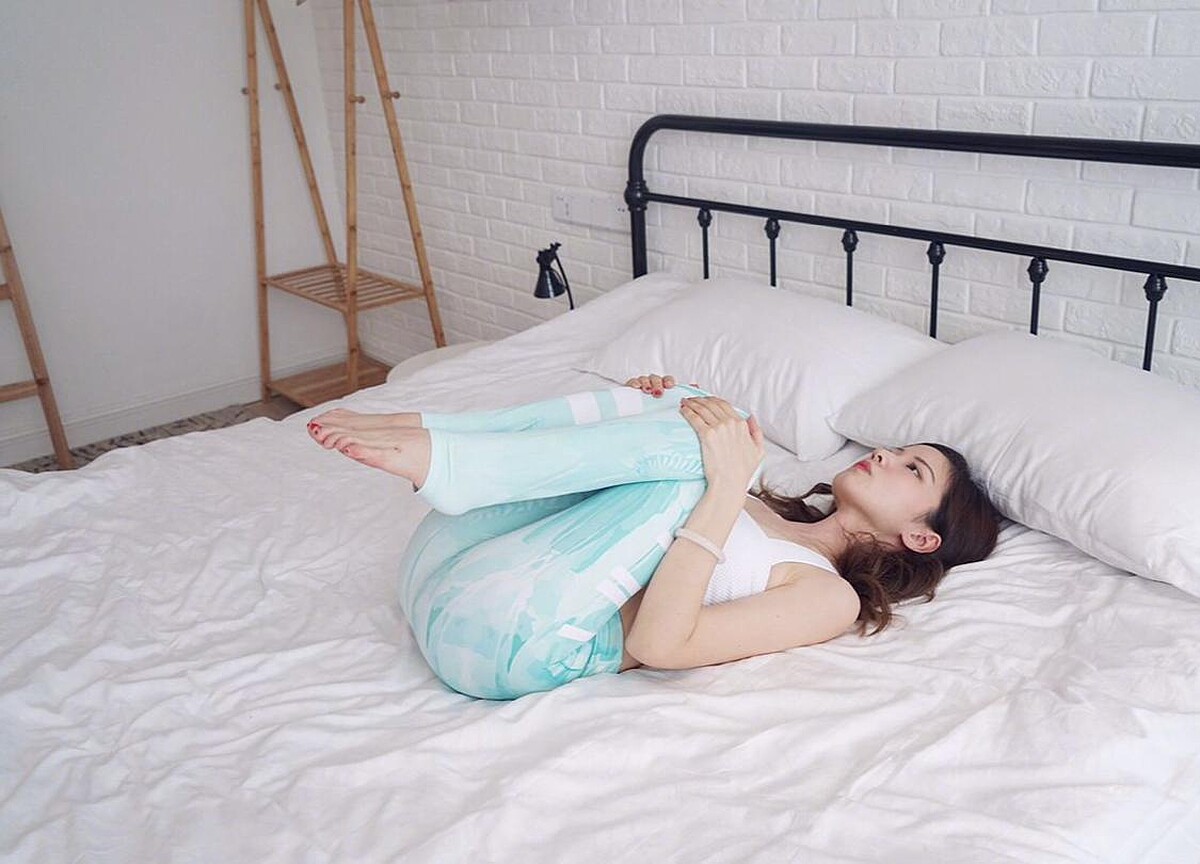 平躺在床上,雙腳上提,雙手抓住腳掌,左右搖晃身體,達到放鬆狀態。