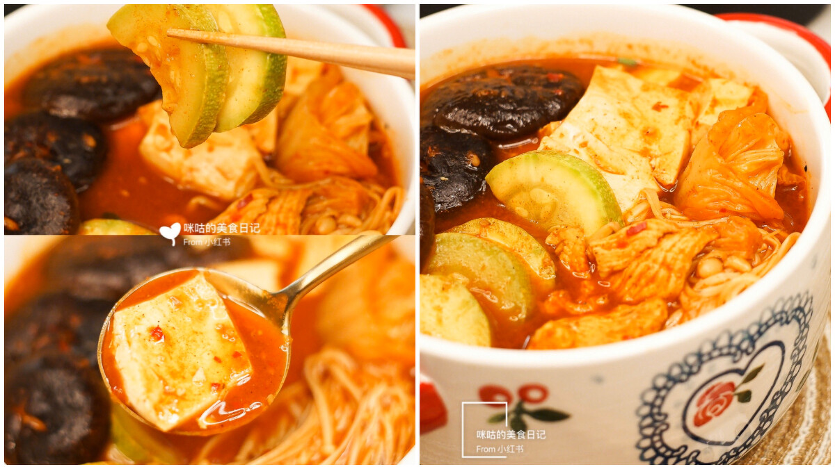 雞胸肉150g、香菇3朵、節瓜一個、豆腐100g、金針菇70g、泡菜、韓式辣醬