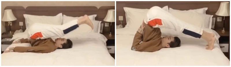 上半身躺床,做出預備要翻滾的姿勢,然後雙腿由下往上伸展至床上後用腳尖頂住,雙手撐腰舉臀,往頭頂拉伸,約30秒。