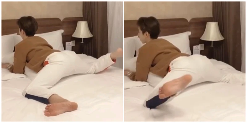 趴於床上,雙手手肘撐起身體,雙腿往外彎曲,雙腳腳板同時往外伸,坐這動作時腹部一定要收緊,也能同時瘦肚子,上半身要撐住,千萬不要趴下可以改善體態,左右腳輪流為一組20次,共5組。