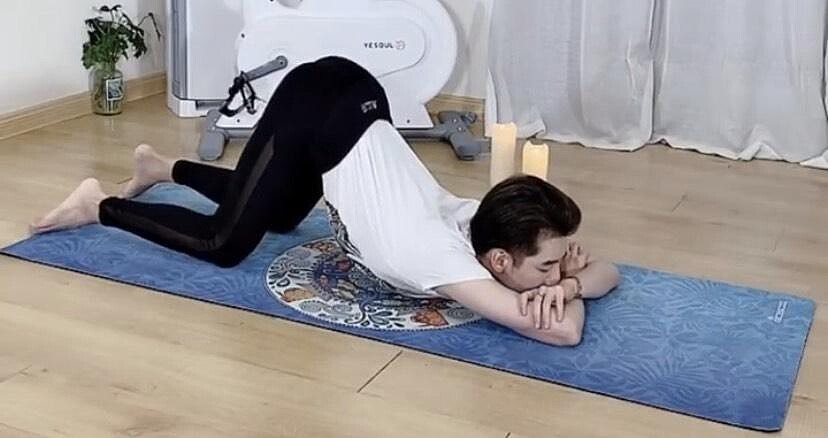 俯趴瑜珈墊上用手肘支撐身體,將雙手往後拉伸並握住往上彎曲的雙腳,使勁抬頭挺胸,直到全身有拉伸的痠痛感,此動作堅持10天,瘦臉、提臀、消除雙下巴,伸展腹部,消除贅肉,請堅持下去!