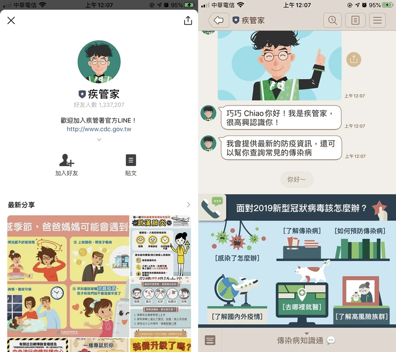 關於疫情的資訊,也推薦加入疾管署官方Line好友帳號「 疾管家 」,裡面有許多武漢肺炎的最新相關資訊,包括疾病介紹、預防方法、國際疫情等諮詢功能,第一手知道正確資訊、避免恐慌,才能更好的保護自己。