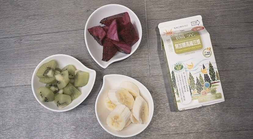 /食材清單/香蕉半根、奇異果1顆、紅色火龍果1/4顆、無糖高纖豆漿450cc