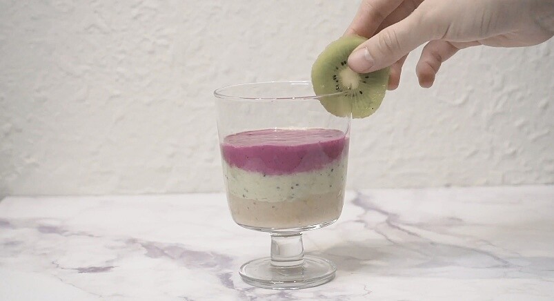 Step2:將三種口味的水果豆漿,分層倒入玻璃杯中,攪拌或分層飲用皆可。