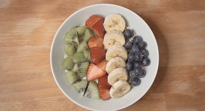 Step1:將奇異果、香蕉與草莓分別切成丁後放入已裝好燕麥或健康無調味穀片的碗中。