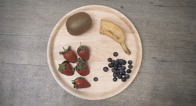 /食材清單/奇異果一顆、香蕉半根、藍莓數顆、草莓數顆、燕麥或健康無調味穀片半碗、無加糖黑豆漿250cc